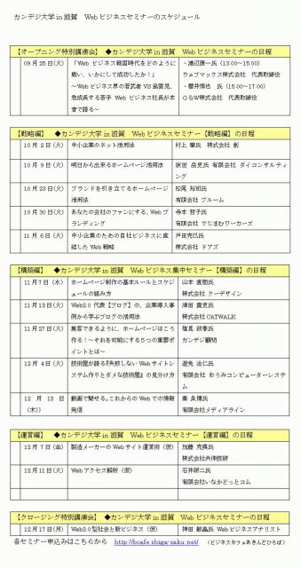 Webビジネスに関心ある皆さんへ カンデジ大学in滋賀 Webビジネス集中セミナー【構築編】の案内をさせていただきます。 ------------------------------------------------------------------------ ■滋賀県SOHOセミナー カンデジ大学in滋賀 Webビジネス集中セミナー【構築編】 Webビジネスにおいて、基本的なホームページの製作ルールやシステムを構築していく上で重要なポイント等について、 関西デジタルコンテンツ事業協同組合の組合員であり、Webビジネス業界に携わる5名の講師の方々にお話いただ