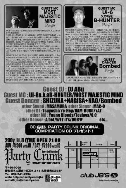 (Guest DJ) DJ ABu (Guest MC) Ui-6 a.k.a B-HUNTER MOST MAJESTIC MIND (Guest Dancer) SHIZUKA+NAGISA+NAO Bombed (Sound) MASAMURA (Singer) MAC-O (DJ) Tsuyoshi Yo-Hey HAM-BURG YAZ (MC) Young Bloods Tosiova O.C (Dance) A'bet WET it's DUBハート BLACK SHEEP etc... PARTY CRUNK FAMILY チョイス曲コンピプレゼントあり!!