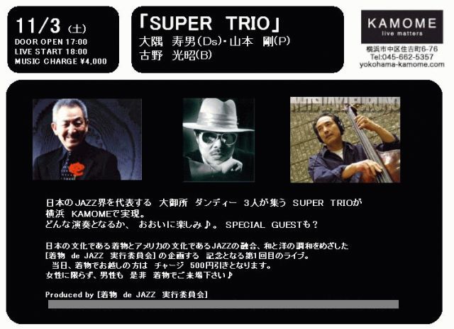 [着物deJAZZ実行委員会]プロデュース SUPER TRIO JAZZ LIVE 11/3(土・祝日)LIVE START 18:00〜 2st入れ替えなし MC \4000 (但し着物でご来場の方は\3500)   KAMOME live matters 231-0013 神奈川県横浜市中区住吉町6-76 Tel 045-662-5357 http://www.yokohama-kamome.com/index.html 大隅寿男  http://mixi.jp/view_community.pl?id=2037782 山本剛    http://mixi.jp/view_community.pl?id=770362 古野光昭  http://mixi.jp/view_community.pl?id=1861800 [着物deJAZZ実行委員会]がプロ