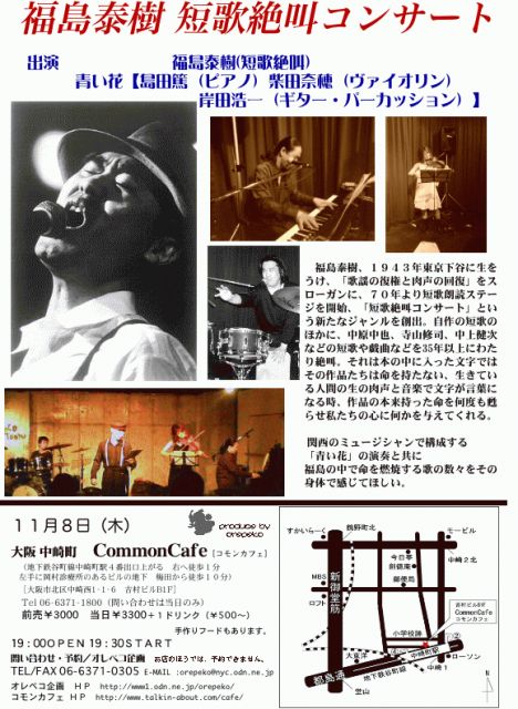11月8日(木) 福島泰樹 短歌絶叫コンサート 福島泰樹(短歌絶叫) 青い花【島田篤(ピアノ)柴田奈穂(ヴァイオリン)岸田浩一(ギター・パーカッション)】  福島泰樹、1943年東京下谷に生をうけ、「歌謡の復権と肉声の回復」をスローガンに、70年より短歌朗読ステージを開始、「短歌絶叫コンサート」という新たなジャンルを創出。自作の短歌のほかに、中原中也、寺山修司、中上健次などの短歌や戯曲などを35年以上にわたり絶叫。それは本の中に入った文字ではその作品たちは命を持たない、生きている人間の生の肉声と音楽で文字が