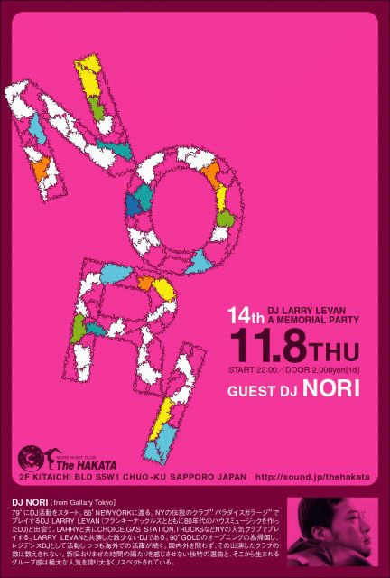 11/8(木) 伝説のDJ Larry Levanの命日です。 今年もDJ NORIさんをゲストに招き追悼Partyを行います。 NORIさんがリアルタイムに感じてきた思い出のGARAGE MUSICで踊り明かしましょう! =============================================== 2007.11.8.木曜日 【DJ Larry Levan : a Memorial Party】 Guest DJ NORI (Gallery, Smoker) START: 22:00 Entrance Fee:2000yen(1drink) =============================================== DJ NORI(from Gallery Tokyo) 1979年にDJ活動をスタート。1986年に渡米しNYのFu