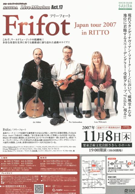 2007/11/8(木) 滋賀 栗東芸術文化会館さきら 滋賀県栗東市綣二丁目1-28 TEL:077-551-1455 http://www.sakira-ritto.net/index.html ■OPEN 18:00 ■START 19:00 ■前売 3,700円 ■当日 4,000円(1ドリンク付、全席自由) 未就学児入場不可 (※託児サービスあります。10/28(日)までに要予約) ■チケット 8/26(日)発売 ・栗東芸術文化会館さきら TEL:077-551-1414 ・ローソンチケット TEL:0570-084-005 (L=59182) ・電子チケットぴあ TEL:0570-02-9999(P=267-472) ・e+(イープラス) ・アルプラザ:
