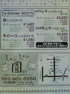 地元でオフ会の第二回目を開催します。 日時:11月9日 金曜日    20:15 〜 21:45 場所:しゃぶしゃぶ圓        東海市富木島町    北広54ー1    052ー601ー5550 会費:\1,980(コース料理代)   +飲み物代(頭割り)。 電車で来る方は、太田川駅に、20時集合。 現地に直接行かれる方は、20:15に集合お願いします。 前回は全員初対面同士でしたが、同じ地元に住んでるだけあって出身校の話等で、すぐに打ち解けて楽しいオフ会となりました。 地元の縁を大切にしていきたいので継続して開催していきたいと