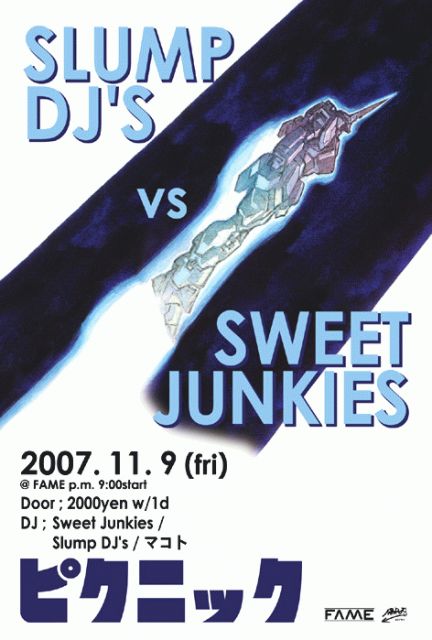 祝FAME2周年!! そして前日11/9にはピクニックがレギュラー化4周年を迎えマス。 FAME2周年の前夜祭がてら皆様遊びにいらしてください! 2007. 11. 9 (fri) 「ピクニック」 @ FAME p.m. 9:00start Door ; 2000yen w/1d Guest DJ ; Sweet Junkies DJ ; Slump DJ's (みのる+マサキ) / マコト 4周年という事で、松本からスイートジャンキースがゲストで登場! 皆さん、是非駆け付けてくださいね! ※今回はいつもと違って金曜日の開催ですよ!お間違えなく〜 ピクニックコミュ http://c.mixi.jp/picnic_with_slump_djs