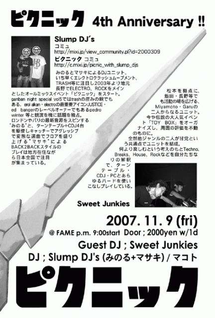Door ; 2000yen w/1d Guest DJ ; Sweet Junkies DJ ; Slump DJ's (みのる+マサキ) / マコト ピクニックもビビる事に4周年です。 4周年という事で、松本からスイートジャンキースがゲストで登場! 皆さん、4周年祝いに是非駆け付けてくださいね! ※今回はいつもと違って金曜日の開催ですよ!お間違えなく〜 ピクニックコミュ http://c.mixi.jp/picnic_with_slump_djs スランプコミュ http://mixi.jp/view_community.pl?id=2000309