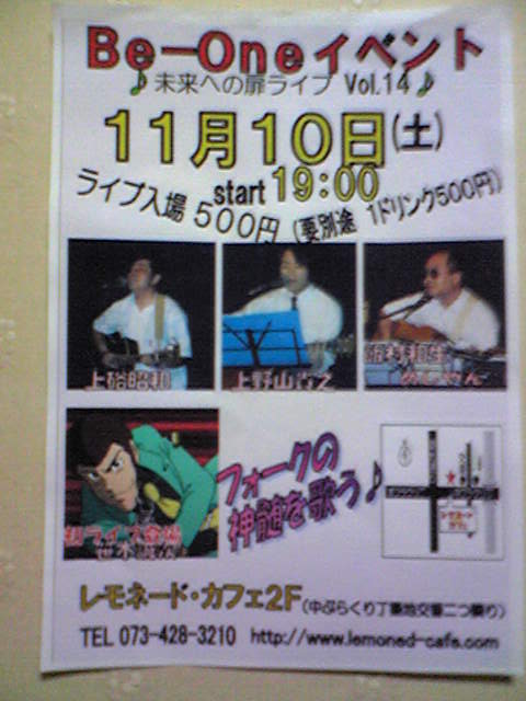 フォークの神髄を歌う 出演…上硲昭和・上野山貴之・飯村和生・笹木誠次 レモネードカフェ2階(中ぶらくり丁築地交番二つ隣り) ライブ入場 500円(要別途 1ドリンク500円) 合計 1000円なり〜 開場=18:30 開演=19:00