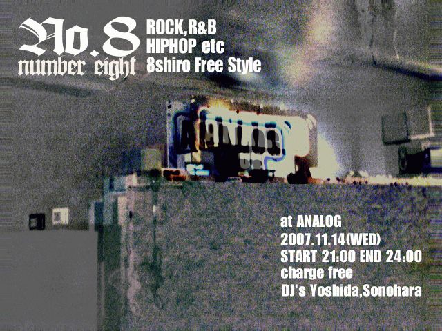 どもヨシダといいます。 八代市ANALOGにて、イベントという訳ではなく平日レギュラー目指して、良い音届けられればと思います。 サウンド的に、R&B Classic,HipHop Classic,Dance Classic,Alternative Rock,Melodic Core,Ska,Emo当たりです。 コミュ参加の方、お近くの方、アナログでの飲み・はしゃぎ・語りのBGMとしてどーぞ。 No.8【Number Eight】 2007/11/14(水) 21:00〜24:00(以降通常営業) @ANALOG CHARGE FREE DJ's Yoshida ,Sonohara(ANALOG) ※22時以降は音を絞る場合もございます。 ※飲酒運転は厳