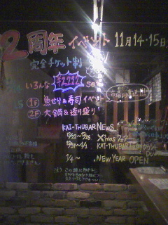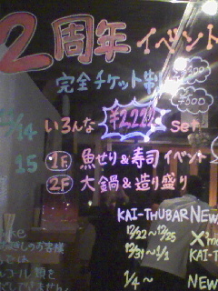 11月15日はKAI-THUBARの二周年イベントを開催します生ビール300円やお寿司など普段のKAI-THUBARでは無い面白イベント企画 しかも前日14日は二周年前夜ってことでめーっちゃお得な2222円特別セットを実施なにやら職人さんが来るとか来ないとか 只今KAI-THUBAR CLUB会員に特別前売りチケット販売中限定なのでお早めに 詳しくはスタッフまで 普段の感謝を込めてお贈りするKAI-THUBAR二周年是非皆さんで盛り上がりましょう