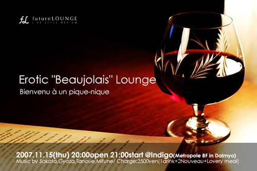 ボンジュー♪ マダム。 ボンジュー♪ ムッシュー。 今年もフランスの南東部、リヨンの北に位置するボジョレーから、新酒のワイン『ボジョレー・ヌーヴォー(Beaujolais nouveau)が届けられます。 今回のErotic Loungeは、解禁日である11月15日(木)に『Erotic Beaujolais Lounge 2007』と題した解禁パーティーを開催します。 当日は、博多GOTOKUのシェフ自慢のビュッフェをはじめ、フランス流のピクニック(PIQUE-NIQUE)スタイルを取り入れたバケット、パテなどをご用意して…そして、仕上げはErotic LoungeレジデントDJによるスタイリッシュ