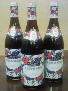 第13回「ボジョレー・ヌーボー」 みなさん、こんにちは。 またまたご無沙汰になってしまいましたが、この日にワイン会をやらないようでは、もうワイン倶楽部とは言えません。ということで、今年もワインの一大祭りヌーボー解禁日に、ボジョレー祭を開催いたします。 毎年11月の第三木曜日がプリムール(新酒)の解禁日と定められていますが、プリムールとして解禁して良いワインは実は生産地も限られていて、その筆頭となっているのがボジョレー村というわけです。ちなみに、その他の地域(ボルドー等)のワインは、飲めるようになるまで、