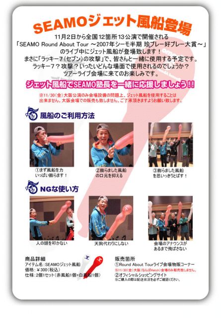 『SEAMO Round About Tour〜2007年 シーモ半期 珍プレー好プレー大賞〜』 【公演日・会場】 ・11月2日(金) Zepp Fukuoka 開場・18:00/開演・19:00 問合せ:キョードー西日本 (092)714-0159 オープニングアクト:手裏剣ジェット ※グッズ先行販売開始 16:30 ・11月3日(土) 鹿児島市民文化ホール(第2) 開場・17:30/開演・18:00 問合せ:K&Mコーポレーション (099)223-7710 ※グッズ先行販売開始 16:00 ・11月15日(木) Zepp Sapporo 開場・18:00/開演・19:00 問合せ:WESS (011)614-9999 オープニ