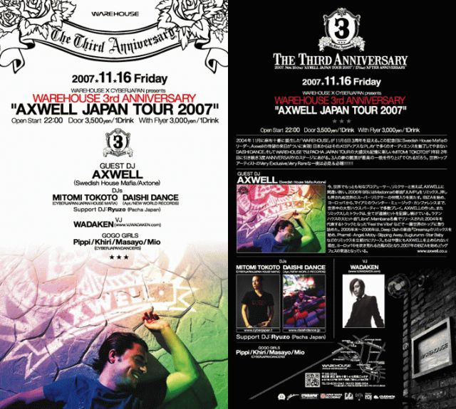 WAREHOUSE × CYBERJAPAN presents WAREHOUSE 3rd ANNIVERSARY "AXWELL JAPAN TOUR 2007" 2004年11月に麻布十番に誕生した「WAREHOUSE」が11月16日3周年を迎える。 この記念日にSwedish House Mafiaのリーダー、Axwellの待望の来日がついに実現! 日本からはそのメロディアスなPLAYで 多くのオーディエンスを魅了してやまないDAISHI DANCE、 そしてWAREHOUSEではPACHA JAPAN TOURの 大盛況も記憶に新しいMITOMI TOKOTOが 、1年目2年目に引き続き3度ANNIVERSARYのステージにあがる。 3人の夢の競演が最高の一晩を作り上げ
