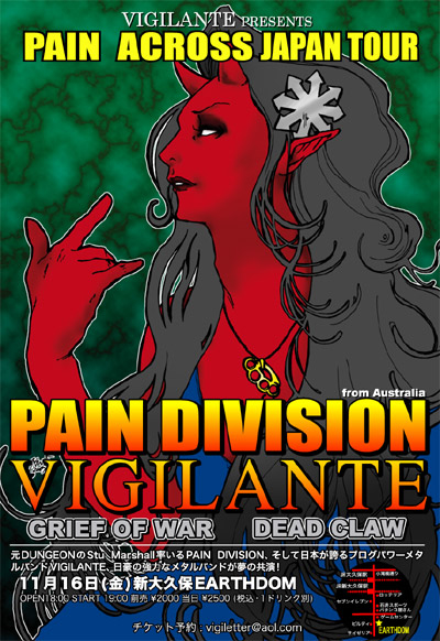 「PAIN ACROSS JAPAN TOUR 2007」 OPEN 18:00/START 19:00 adv \2000/door \2500 +1D\500 w/PAIN DIVISION/DEAD CLAW/GRIEF OF WAR/CERBERUS VIGIは20:55〜出演予定です。オーストラリアのパワーメタルバンドPAIN DIVISIONとの共演!!