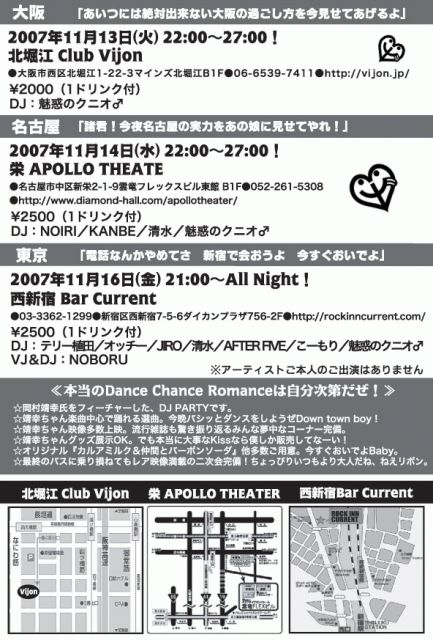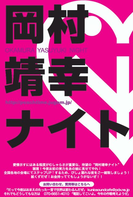 お世話になっております。 「告白」ツアー終了後、東京開催のお知らせです。 各地開催はもちろんですが、 当日は打ち上げ気分でご一緒出来れば幸いですよ。 “岡村靖幸ナイトin東京” 日時:11/16(金)21:00〜All Night! 会場:西新宿Bar Current 03-3362-1299 住所:新宿区西新宿7-5-6ダイカンプラザ756-2F http://rockinncurrent.com/ 当日:\2500(1drink付) DJ:テリー植田/オッチー/JIRO/ 清水/AFTER FIVE/こーもり/魅惑のクニオ♂ VJ&DJ:NOBORU <本当のDance Chance Romanceは自分次第だぜ!> ☆岡村靖幸氏