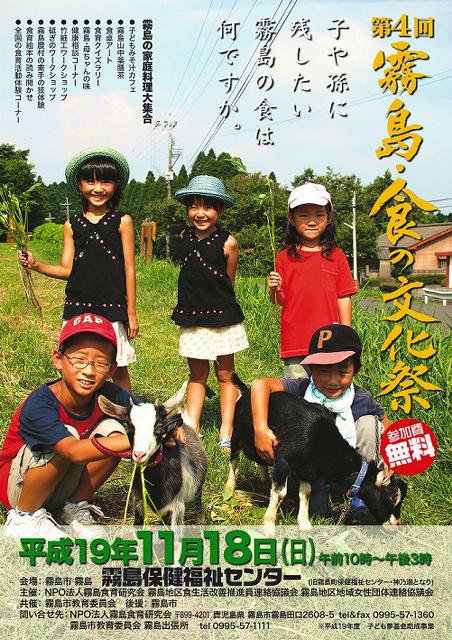 こんばんは、鹿児島県霧島市でNPO法人霧島食育研究会の一人として活動しているまいんといいます。 「子や孫に残したい霧島の食は何ですか」をテーマに、見て・味わって・体験して学ぶイベントです。 展示やワークショップなど、かなり濃い内容ですが、簡単には説明できないので、ホームページの第4回霧島・食の文化祭のコンテンツを参照してください。 霧島食育研究会のホームページ http://www.geocities.jp/kirisyokuiku/ 九州は鹿児島で地道に活動しています。 地方での食育活動の一つのあり方だと思っています。