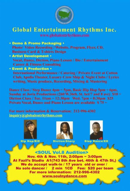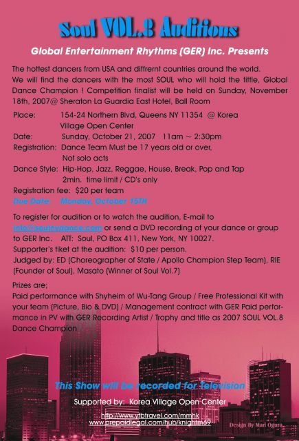 先日、日曜日のインターナショナル・ダンス・コンペティションのオーディションで3名の日本人ダンサー・チームが最終まで残りましたよ!11月18日の本選には、アメリカ・スウェーデン・ブラジルの3カ国も出場、優勝を狙います。審査には、観客の反応が大きく影響します。一人でも多くの日本人に会場に来て応援してください!