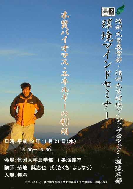 農学部と環境マインドプロジェクト推進本部という団体の企画で、環境セミナーが開催されます。 日時・演題などは下記のとおりです。 当日は… 木質バイオマス・エネルギーの概要、岐阜県における動き、導入の方法等について、パワーポイントやDVD・資料などでお話してくださるそうです。 興味のある方はぜひ聴きにきてください ***************************************** 日時:平成19年11月21日(水) 15:00〜16:30 場所:信州大学農学部11番講義室 講師:菊地 與志也氏(きくち よしなり) 岐阜