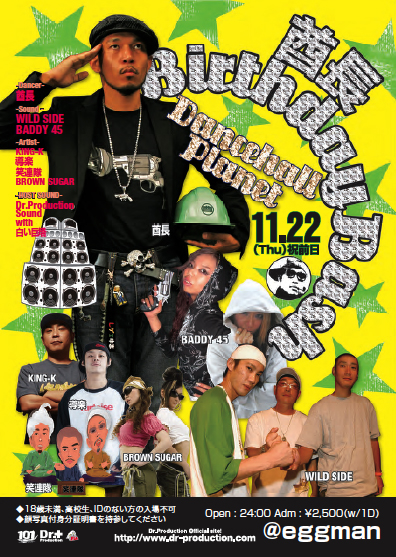 Dancehall Planet - 酋長 Birthday Bash - 11/22(Thu)祝前日 @eggman Open : 24:00 Adm : ?2,500(w/1D) - Birthday Dancer - 酋長 - Guest Sound - WILD SIDE BADDY 45 - Guest Artist - KING-K 導楽 笑連隊 BROWN SUGAR - Sound- Dr.Production sound with sound system ◆当日は18歳未満、高校生、IDのない方の入場不可になります。顔写真付身分証明書を持参してください。