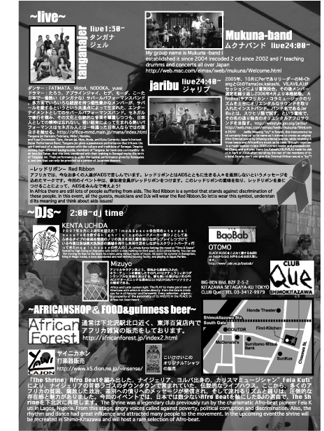 下北沢のアフリカ雑貨屋「AfricanForest」がお届けするアフリカブラックミュージックの世界。 アフリカンもジャパニーズもみんなみんな朝まで眠れない! 秋も深まり外は寒くなってきましたがAfricanForestは熱い! そんなAfricanForestがお届けするオールナイトイベント「SHRINE Vol,3」 アフリカンダンス、アフリカン○○ あらたな出逢いもあるかも・・ 以下出演者です。 [live] Mukuna-band 1990年コンゴ民主共和国から来日したムクナさんは「劇団四季」ミュージカル「ライオンキング」の初代パーカッショニストとして