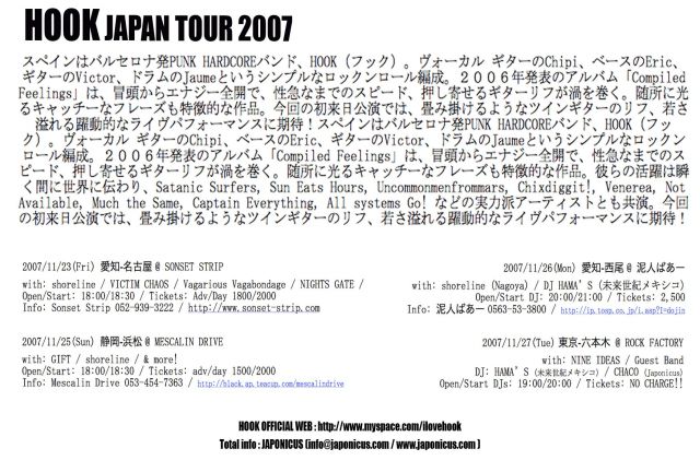 HOOK Japan Tour 2007 スペインはバルセロナ発PUNK HARDCOREバンド、HOOK(フック)。ヴォーカル ギターのChipi、ベースのEric、ギターのVictor、ドラムのJaumeというシンプルなロックンロール編成。2006年発表のアルバム「Compiled Feelings」は、冒頭からエナジー全開で、性急なまでのスピード、押し寄せるギターリフが渦を巻く。随所に光るキャッチーなフレーズも特徴的な作品。今回の初来日公演では、畳み掛けるようなツインギターのリフ、若さ溢れる躍動的なライヴパフォーマンスに期待!スペインはバルセロナ発PUNK HARDCOREバンド、HOO