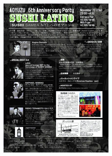 INVITATION Aoyuzu 6th Anniversary Party SUSHI LATINO 《SUSHI SAMBA》へのオマージュ November 22 (Thu) 23:30 〜4:30 @Aoyuzu 本メールをプリントアウトまたは携帯画面にて提示されたお客様、 エントランスフィー1500円 /1drink で何名様でも御招待させていただきます。 パリ発、恵比寿着。そしてNYへ。「食」と「音楽」の素敵なコラボレーション。食都パリ「hotel Costes」,イビサ「カフェ・デル・マール」、ロンドン「MOMO」、「SKETCH」。世界のラウンジ・レストランとコラボレーションしてきたAoyuzuが、NYのPOPなブラ