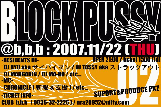 BLOCK PUSSY @ BBB 1500円{1D} 11月22日祝日前 DJ RYOakaサイバイマン(C.F.X) DJTASSYakaストラックアウト(C.F.X) DJMARGARIN DJMA−KO DJWonderful(C.F.X) MC  CHRONICLE?  「斬眼&玄樹」(C.F.X)