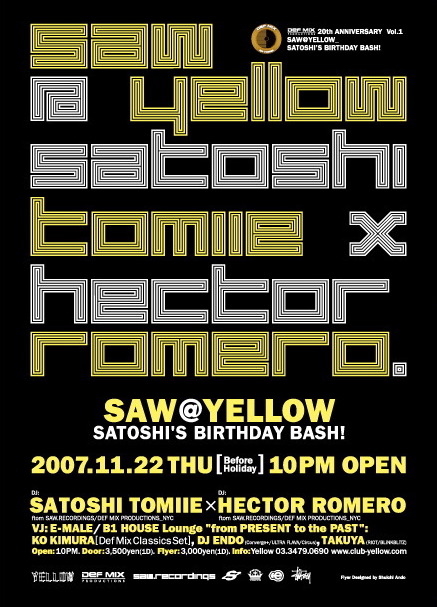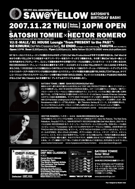 管理人様失礼します! パーティーの告知をさせて頂きます! 尚、私宛てに直接メッセージを頂ければディスカウントでご案内できますので是非遊びにいらして下さいね! 以下詳細となります。 2007/11/22 (木・祝前日)Def Mix 20th Anniversary 『SAW@YELLOW』 --Satoshi Tomiie Birthday Bash!!-- Main Floor: SATOSHI TOMIIE & HECTOR ROMERO B1 HOUSE Lounge `from PRESENT to the PAST`: KO KIMURA (DefMix Classics Set), DJ ENDO (Converge+/ULTRA FLAVA/Circus), TAKUYA (RIOT/BLiNK BLiTZ) NYをベースにハウスミュージッ