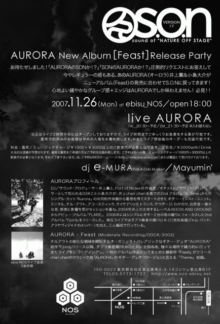 お待たせしました!圧倒的リクエストにお答えして今やレギュラーの感もある、あのAURORA(オーロラ)井上薫&小島大介がNew album「FEAST」発売に合わせてS・O・Nに戻ってきます!心地よい緩やかなグルーブ感+エッジはAURORAでしか味わえません!必見!!