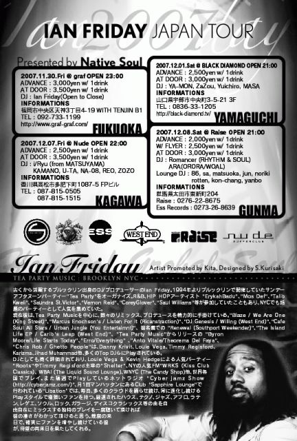 Ian Friday Japan Tour 2007がいよいよ来週から始まります。新旧、ジャンル関わらずPlayするスタイルで独特のgrooveを作りだしている、Ian FridayのPlay、是非一度体験して見てください。彼の凄さがわかって頂けると思います。アイソの絞り方も独特でJoe、Timmy、Danny、Kim等が紡ぎ出すグルーブとは一味違ってて、かなりぶっ飛んでます。近郊の方、是非是非、遊びに来て下さい。