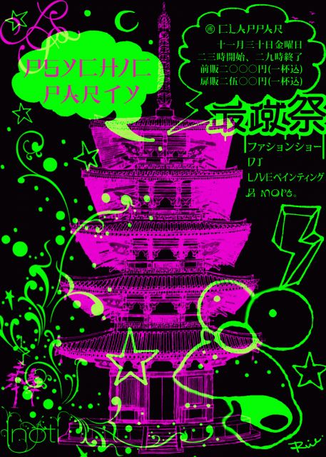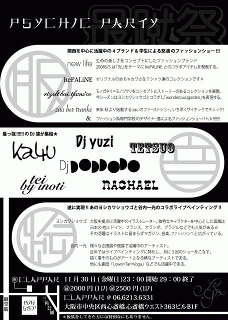 復活第一回目となる今回は、新たに誕生した注目のファッションユニットSummit Roomとのコラボレーションパーティーになっており、スタイリスト坂崎タケシさんをゲストに迎え、DJ Oni、Piano with headphoneのデビューライヴ、日本の伝統楽器を配