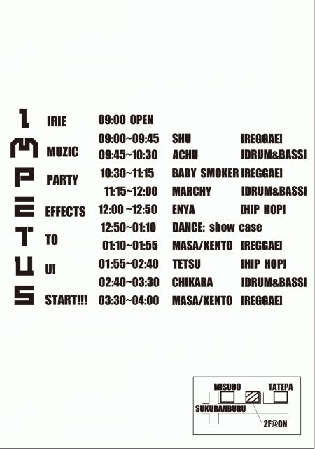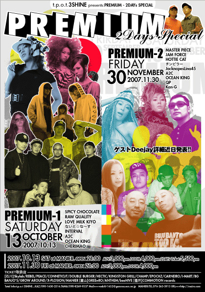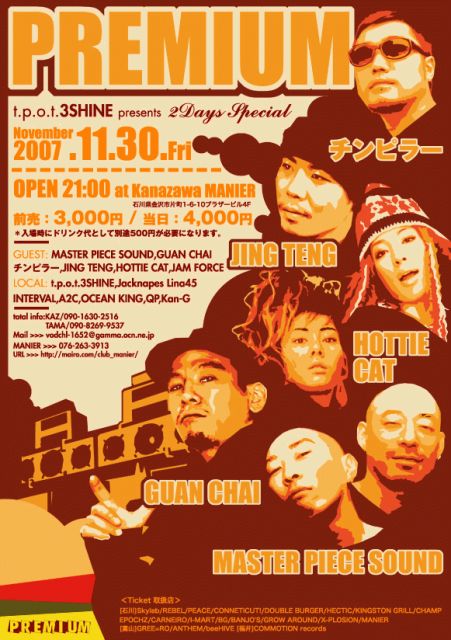 楽しい一日なること間違いなし!!! 福井の皆さんも是非騒ぎにきてくださ〜い!!! t.p.o.t. 3SHINE presents 『PREMIUM vol.2』 〜2DAYS SPECIAL〜 〈2日目〉 11月30日(金)@ 金沢MANIER START/21:00〜 前売/¥3,000 当日/¥4,000 〈GUEST DEEJAY〉 GUAN CHAI : rep YOKOHAMA JING TENG : rep OSAKA チンピラー : rep TOYAMA 〈GUEST SOUND〉 MASTER PIECE:rep TOKYO JAM FORCE:rep FUKUI 〈GUEST DANCER〉 HOTTIE CAT : rep TOKYO 〈SOUND〉 t.p.o.t. 3SHINE Jacknapes Lina45 INTERVAL