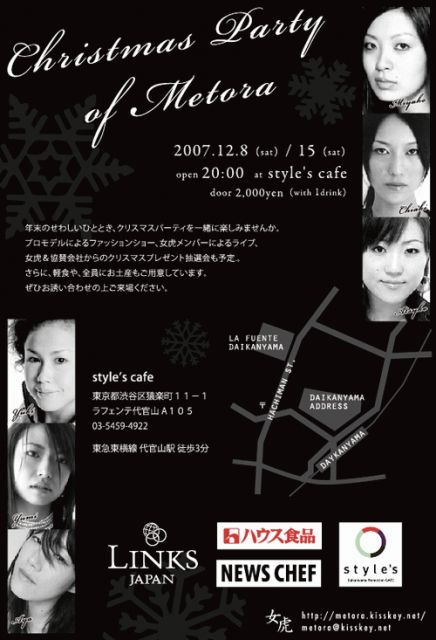 今年も残すところあとわずかとなってきました。 せわしい年末のひととき、女虎と一緒にクリスマスパーティを楽しみませんか? 普段のイベントは「見に行く」感じかもしれませんが、 今回はBBQのときのようなパーティをイメージしています。 新しいお友達もつくっちゃいましょう! 2003年度ミスユニバースジャパン宮崎京(世界大会5位)、 日本大会3位佐藤祐美をはじめとする、ファイナリスト5人を含む 女虎(めとら)というグループでクリスマスパーティをやります! Hurley(http://www.hurley.jp/)のファッションショー、ミニライブ、