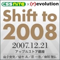 2007年も残すところ、2ヶ月を切りました。 久しぶりのCSS Niteは、古巣のアップルストア銀座にて、XHTML+CSS (r)evolutionとの合同企画にてお送りします。 ・日時:2007年12月21日金曜日 18:30から(予定) ・場所:アップルストア銀座 3F Theater ・参加費:無料 ・事前登録:基本的に不要 2007年のWebにまつわるさまざまな出来事を振り返り、2008年につなげるための「総決算」といった内容を予定しています。 出演: ・益子貴寛(サイバーガーデン) ・植木 真(インフォアクシア) ・原 一浩(karadesign/fxb) ・鷹野雅弘