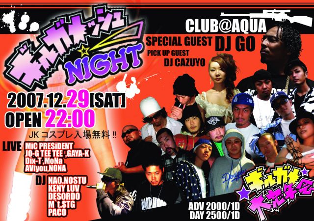 2007.12.29 (sat) 埼玉 鴻巣@AQUA 『ギルガメッシュ NiGHT vol.4』 ★ギルガメ 大忘年会★ OPEN-22:00 ADV 2000/1D DAY 2500/1D ★SPECiAL GUEST★ DJ☆GO ☆PiCK UP GUEST☆ DJ CAZUYO ☆LiVE☆ MiC PRESiDENT JO-G&TEE TEE 254 Dix-T MoNa AViyou NONA ☆DJ☆ NAO NOSTU KENY LUV DESORDO M't STG PaCo 今年の締めくくりはコレで決定!!! 飲んで踊って騒いで みんなで楽しく一年を終えましょうwww 今回もモチロン、 制服