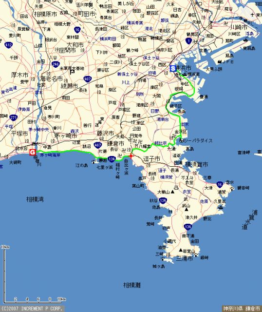 10:00 桜木町、みなとみらい集合(横浜美術館対面スターバックス) http://starbucks.mapion.co.jp/2015 ↓ 山下抜けて産業道路〜357 ↓ 八景島周辺 途中集合(出発10:30として11:00位?) http://kokomail.mapfan.com/receivew.cgi?MAP=E139.38.53.1N35.20.12.9&ZM=11&CI=R 357を横浜方面からそのまま八景島方面へ ↓ 即出発〜16号〜環状4号 ↓ 朝比奈廻り〜鎌倉 ↓ 134号 ↓ !!!129合流のデニーズ 小休止(営業時間が11時とかまでみたいなので変更!_) 134号茅ヶ崎ガスト http://sp.chizu