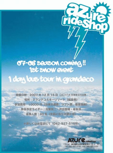 日程・詳細等決定いたしました〜!! 今シーズンは雪便りも早く、みんな滑りたくてしょうがないだろうなぁ〜ということで初の試みとなりました! 今回の開催は千葉県にあるお洒落SHOP『LOWER EAST 81』とのフレンドリー開催ということで現地(グランデコスキー場)で合流予定となっています。 『日帰りSNOWツアー』in グランデコスキーリゾート 開催日時:2007年12月15日(土)*14日深夜立川出発 場所:グランデコスキーリゾート(福島県) http://www.grandeco.com/ 参加費用:10000円(往復交通費、リフト費、傷害保険) 参加予