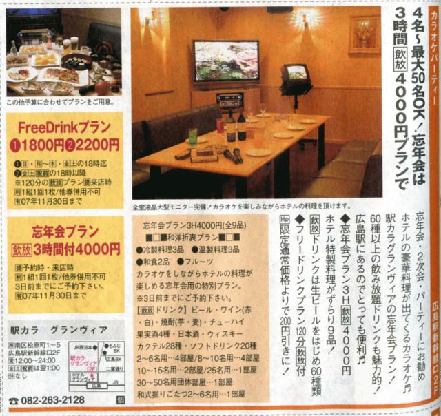 まだ予定です。 場所:リバーピア 日時:2007年12月15日19:00〜(予定) 会費:3,000円 食べ放題〜飲み放題〜です。 2次会は1次会終了時に空いているお店にいきます。 空いていれば「ほとめく」か「珍竹林」です。 延岡の地ビールをこの機会に味わってみませんか? 初参加の方も大歓迎します!! リバーピア紹介 ---------------------------------------------------------------------- 延岡市の中央にある欧風レストラン。 人気の秘密は、出来立ての料理が次から次へとテーブルに並べられる 『飲み放題・食べ放題』のコー