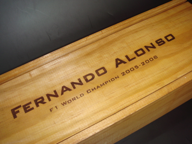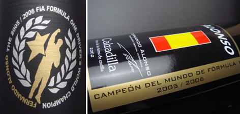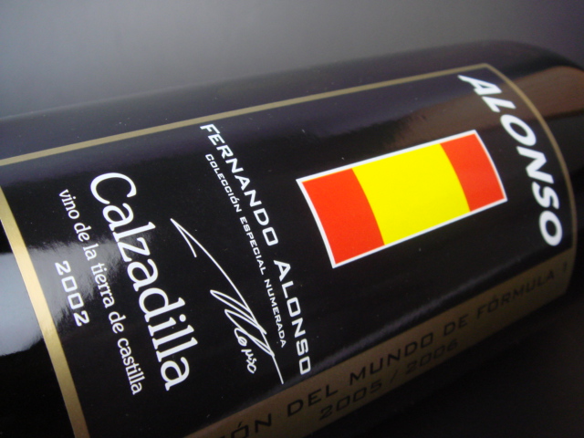 FERNANDO ALONSO F1 WORLD CHAMPION 2005-2006 (Calzadilla 2002) F1ドライバーのフェルナンド・アロンソが2005年、 2006年の連続総合優勝を記念してつくったワイン。 このワインの中身はパゴ・デ・カルサディージャと いうワイナリーで、このワイナリーのオーナーと アロンソがとても仲のよい関係であるため、つくら れました。 パゴ・デ・カルサディージャ http://www.pagodecalzadilla.net/inicio_ingles.htm スペインには "grandespagos" というグループが あり、独自の 畑、独自のスタイルのスーパー・ スパニッシュを