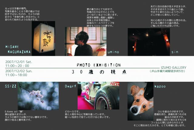 この度1977年生まれコミュ有志による写真展示会を開催することになりました。 今年30歳と言う節目を迎える私たちの視点と言うテーマで開く展示会です。 お時間のある方はぜひともお越しください。 お茶やお菓子を用意してお待ち申し上げています。 -------------------- ■内容 今年30歳になる人たちで作る写真展示会です。プロ・アマ問わず節目を迎える自分たちが見ているものを写真にし、展示するというものです。 ■日程 12/1(土)〜12/2(日) 開場時間 1日:11:00〜20:00 2日:11:00〜17:00 ■場所 東京・J