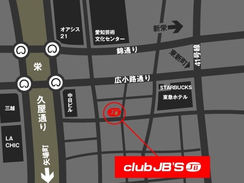 イベントの日程が決まりましたよぉ (11月26日更新) ・出演者の増加&タイムテーブル作成 ★★★タイトル★★★ 『らぐ★ふぇす』 ★★★日時★★★ 12月2日(日) 18:00〜24:00 ★★★開催場所★★★ 名古屋市中区栄4-3-15 丸美観光ビルB1F(画像参照) 『JB’S』 交通機関:市営地下鉄東山線・名城線[栄駅]13番出口より徒歩5分 ★★★出演者★★★ DJ…403、しんや、JIGGY、KING-P、BIG JEWEL、BOOTY-GORIS ダンサー…KEAT、SHINOVI MC…SHINJI、アンチェイン、RaBBy-K