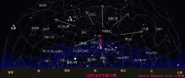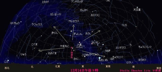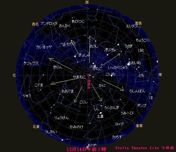 _________________真ん中と右の画像 日を間違い。15日でした。 ふたご座流星群☆彡観測会決定! 小惑星3200番・ファエトンを母天体のふたご座流星群の 12月15日午前3時頃(?)の極大ピークを迎えます。 この流星群は、日本三大流星群の一つで、本年は月齢4で 月光の影響も無く、時間当たり最大60個との予測。 14日午後8時頃、ふたご座(放射点)が東の空に顔を出します。 日が変わった午前2時頃、天頂に到着 (この時間帯が最高の条件かも・・・) 夜明け前、午前5時頃西の空へ 上の写真で確認し