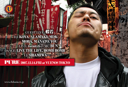 「般若」の渋谷でのライブが十二月十四日(金曜)に、渋谷VUENOS TOKYOで あります。今回は二ヶ月連続の出演だけに、どんなライブが見られるか楽しみです。 メッセージいただければ、ゲストにてご招待いたします。 お気軽にどうぞ☆ 詳細 十二月十四日(金)@渋谷ブエノス 「PURE」 GUEST LIVE 般若 DJ KOYA ALAMKI MDK MOBA TUKASA MANATO P SIDE DJ O-MEAN Son-4. AKANE 毎回ハイレベルなDJ陣と、豪華なショウケースで千人近い集客を誇る、第二金曜のBIG EVENT「PURE」!!12月は11月に引き続き、「般若