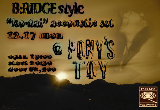 ★2007.12.17 (mon) "Ko-Dai (B:RIDGE style)" @ PONY'STOY 『christmas party 』 ko-dai accoustic set 40名限定ライブ! 受け付けはじめました。 ●open 19:00 ●start 20:30 ●charge\2500 ●(with 1 drink) ☆今回はPONY'STOYもクリスマスにデコレーション〜温かい店内でじっくり唄う Ko-daiを見に来ませんか? ぴかぴか(新しい)40名限定ぴかぴか(新しい)のスペシャル・ライブです! 予約はお早めに!!! 【B:RIDGE style】プロフィール 2004年12月、下北沢BASEMENT BARにて活動を始める。 当初、固定されたメンバーではなく ライ