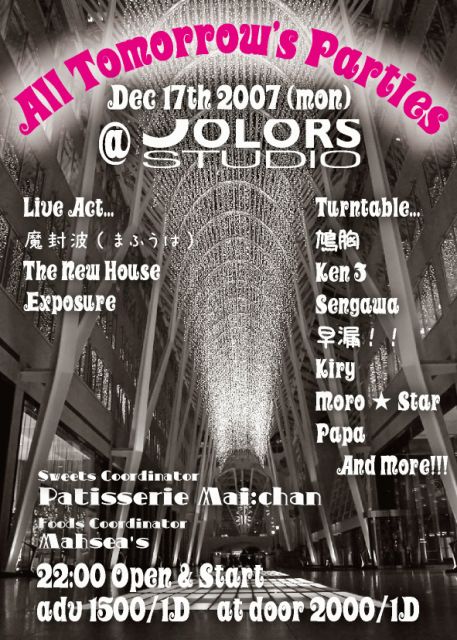 いきなりイベント告知失礼します。 〜All Tomorrow's Parties Vol.1〜 12/17   六本木COLORS STUDIO >OPEN  22:00 〜 CLOSE 05:00<                ADV  1500/1D                DOOR  2000/1D Live act...魔封波      The New House      Exposure Dj's.......鳩胸      Ken3      Sengawa      早漏!!     Kiry    Moro☆    Papa Food.......MAHSEA'S Cake.......Maichan's 当日はケーキ、シャン