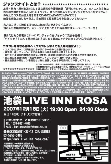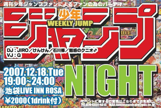 お世話様です。 第2回開催の発表です。 はりきって参りましょう! “ジャンプナイトVol.2” 日時:12/18(火)19:00〜24:00! ※終了後朝まで飲み会完備!オラの元気を分けてやる! 会場:池袋LIVE INN ROSA 03-5956-3463 住所:豊島区西池袋1-37-12ロサ会館B2 http://www.live-inn-rosa.com 当日:\2000(1drink付) DJ:JIRO(YOUNG JUMP編集部)/けんけん/ 石川修/魅惑のクニオ♂ お問い合わせ、ご質問はコチラまで! TEL:070-6651-4010 MAIL:kuniosoundcafe@pdx.ne.jp <ジャンプナイト とは?> 友情・