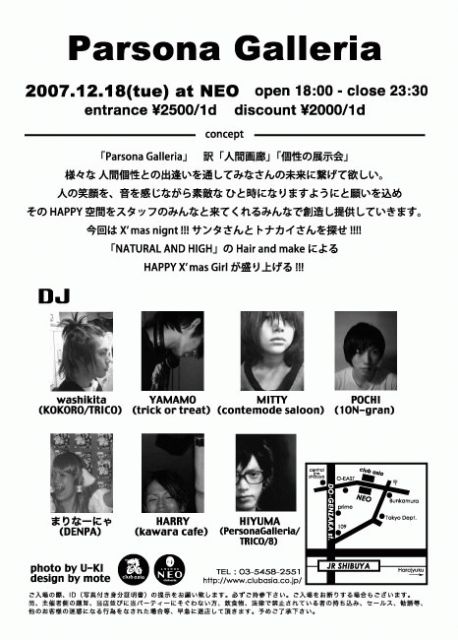 おかげ様で 5回目を迎えることができました* 次回も 遊び心満点で より温かい空間が出来るよーに 努力いたしますのでぜひぜひ遊びに来てください♪ 来てくれる人 手をあげてくださーい♪ はーい* 12/18(TUE) *HAPPY X'mas* 【Parsona Galleria】@Neo OPEN18:00〜23:30 entrance \2500/1d discount \2000/1d 今回は Xmas pA-sO!!! 「NATURAL AND HIGH」のHair and makeによる HAPPY Xmas Girl!!! and!!! U-KIのPhotoとchouxのImage(映像)のコラボ!!!!! and!!!!! サンタさ