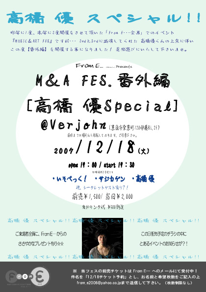 2006年に1度、2007年に2度、計3回の開催をした「From E・・・企画」でのイベント『MUSIC&ART FES』ですが・・・ 2ndと3rdに出演してくれた 高橋優くんの上京に伴い、急遽【番外編】を開催する事になりました! 「From E・・・」presents 『M&A FES.番外編 高橋優 Special』 @Verjohn(恵庭市栄恵町120伊藤BL.2F) ※移転した為以前とは場所が異なります、ご注意下さい。 2007/12/18 OPEN 19:00 START 19:30(〜22:00終了予定) チケット 前売 ¥1,500 当日 ¥2,000 ※どちらも、1ドリンク¥500別途 《