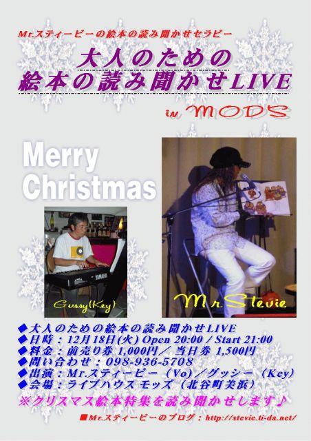 ※12月は“クリスマス絵本特集”を演りますので、前売り券を希望する方は、予約メッセージを下さいね♪ ■大人のための「絵本の読み聞かせLIVE」Vol.3 ■日時:12月18日(火) Open 20:00 / Start 21:00 ■会場:LIVEHOUSE MOD'S ■出演:Mr.スティービー(読み聞かせ&Vo)/ グッシー(ピアノ&Key) ■料金:前売り券 1,000円/ 当日券 1,500円 ■前売り券予約:Mr.スティービーのKOZA薄笑ブログ♪ ■お問い合わせ:098-936-5708