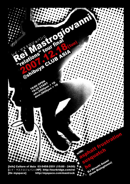レイ・マストロジョバンニ オフィシャルDIARYより: もうすぐ、"relations"ツアーファイナルです。 何を隠そう、レイ・マストロジョバンニ記念すべき日本初自主企画です。 オレゴンではよくイベントを企画してたけど日本では初。 ブッキングは思ってた以上に大変です。 しかし、最高なバンド達が集まり、ツアーファイナルに参加してくれる事になりました。 he, susquatch, asphalt frustration という豪華な3バンドです。 DJは、僕が日本で一番好きなレゲエバンドrisingtonesのASAMIがラヴァーズ、レゲエ、ロックステディで気持ちいいグルー