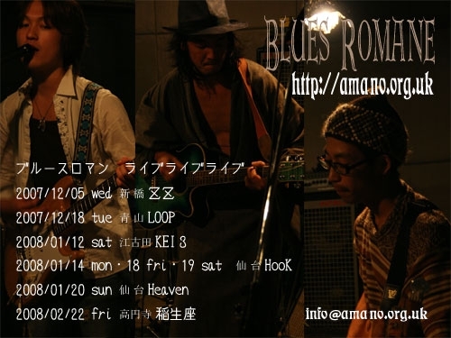 「ブルースロマン」次のライブのお知らせです。 ★★★★★★★★★★★★★★★★★★★★★★★★★★★★★★ 12月18日(火) 青山「LOOP」http://www.live-loop.com/ 「Beautiful days vol,22 ACOUSTIC」 eart 溝田志穂 ブルースロマン:20:35〜です。 シマダケイスケ(from LILY LEE WONDERLAND) LIVE HOUSE LOOP: ◆ 営業時間 17:30-21:30 [月〜土] ◆ 住所 東京都渋谷区渋谷2-1-13-B1 ◆ TEL 03-3797-9933 ◆ MAIL info@live-loop.com OPEN:18:00 / START: 18:50 ADV 200
